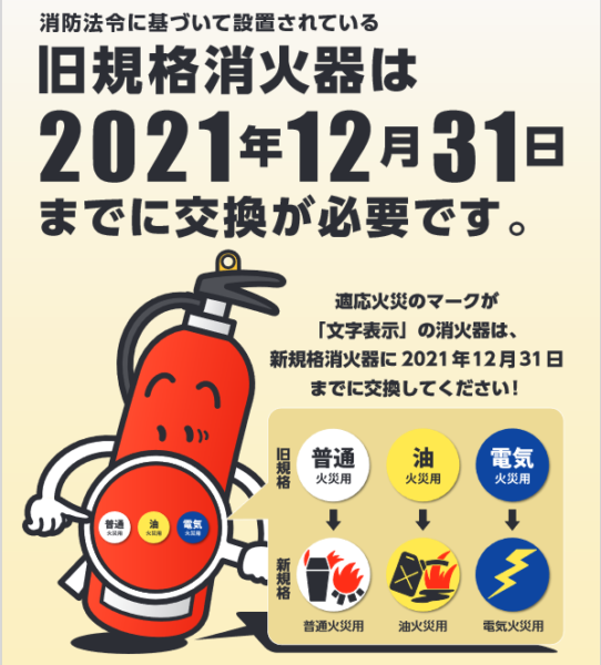 ※2船舶に設置される「船舶用消火器」など、消防法令以外で規格が定められている消火器については、2021年12月31日までの交換の対象となりません。