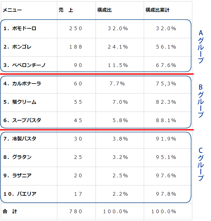 売上順に並べたメニュー表に2本の線を引きます。 1本めは、全体の構成比累計の70%のところ、ちょうど3のペペロンチーノと4のカルボナーラの間です。これをA線とします。 2本めは、全体の構成比累計の90%のところ、6のスープパスタと7の冷製パスタの間です。これをB線とします。 A線より上の売上トップグループをAグループ、A線とB線に挟まれたセカンドグループをBグループ、B線から下の売上グループをCグループとします。